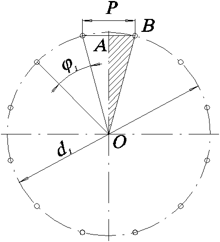 Делительные диаметры звездочек определяют по расположению центров шарниров цепи на зубьях звездочек. Из рассмотрения треугольника АОВ на схеме малой звездочки цепной передачи следует: