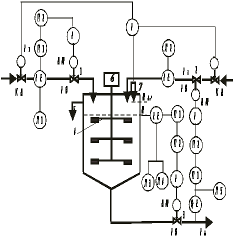 Сигналізації (лампи Л1…Л4) підлягають витрати матеріальних потоків (за їх мінімумом і максимумом), температура потоку на виході (за максимумом) і рівень рідини в апараті (за максимумом і мінімумом).