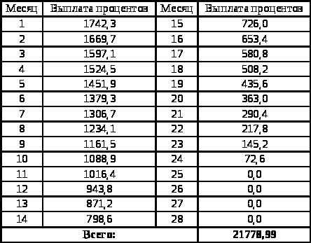 Таким образом, ежемесячный платеж в счет погашения основного долга составит 140000 / 24= 5833,3 рублей.