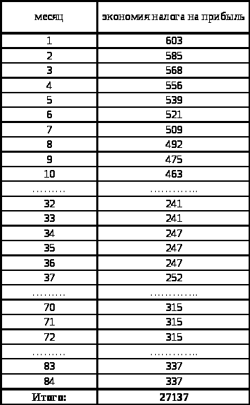 Из приведенного приложения видно, что, начиная с 25 месяца, месяца после расчета с банком, у предприятия начинает чистый приток денежных средств за счет экономии налога на прибыль, что снижает текущую приведенную стоимость по проекту.