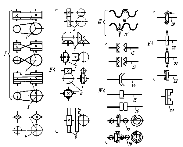 I - ременные передачи плоским ремнем (1), плоским ремнем перекрестная (2), клиновым ремнем (3), 4 - цепная передача; II - зубчатые передачи: цилиндрическими колесами (5), коническими колесами (6), винтовыми колесами (7), червячная (8), реечная (9); III - передача ходовым винтом с неразъемной (10) и разъемной (11) гайками; IV - муфты: кулачковая односторонняя (12), кулачковая двусторонняя (13), конусная (14), дисковая односторонняя (15), дисковая двусторонняя (16), обгонная односторонняя (17), обгонная двусторонняя (18); V - тормоза: конусный (19), колодочный (20), ленточный (21), дисковый (22), патронный конец шпинделя (23)