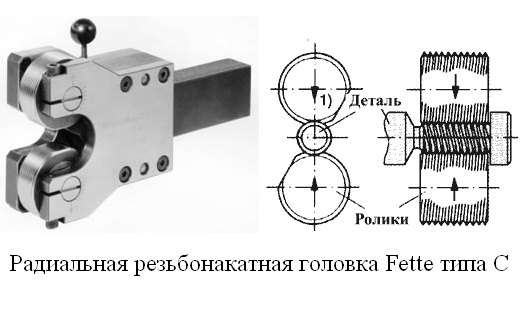 Тангенциальные головки оснащаются двумя цилиндрическими роликами. Применяются для накатывания резьб, длина которых не превышает ширину роликов. Имеют более высокую производительность по сравнению с аксиальными.