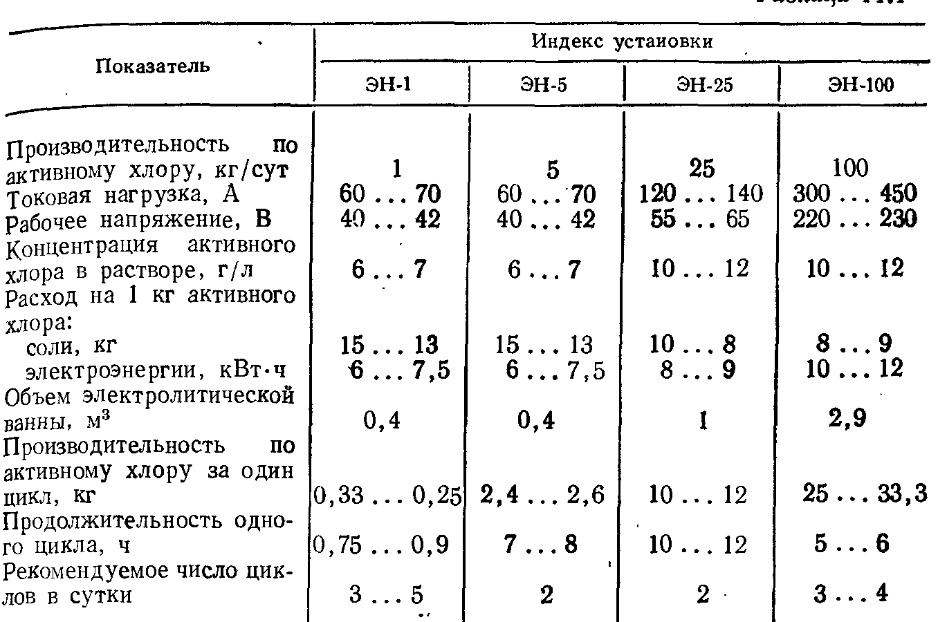В настоящее время в нашей стране серийно выпускается унифицированный ряд непроточных электролизных установок типа ЭН производительностью от 1 до 100 кг активного хлора в сутки. Для небольших водоочистных установок рекомендуются электролизеры ВИЭСХ (0,1 ...0,2 кг/сут хлора), а также электролизеры ЭН-1 и ЭН-5 производительностью 1 и 5 кг активного хлора в сутки. При необходимости можно осуществлять централизованное получение гипохлорита натрия на одном из пунктов с последующей доставкой его к отдельным потребителям. В этом случае могут применяться установки ЭН-25 или ЭН-100 производительностью 25 и 100 кг активного хлора в сутки. Количество электролизеров должно быть не более трех, из которых один резервный.
