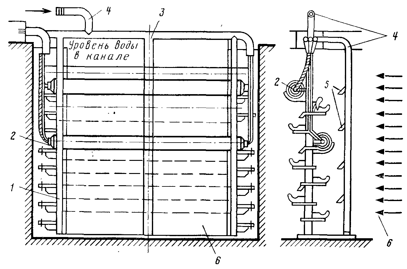 1 — металлическая рама с кронштейнами; 2 — блоки с бактерицидными лампами РКС-2,5; 3 — металлические пластины; 4 — трубопровод напорной воды для отмывки чехлов; 5 — промывные сопла; 6 — канал подачи обрабатываемой воды
