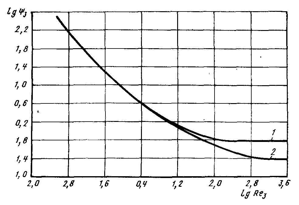 Рис. 8.2. Графики Re=f(Ka) и ψ3=ф(Кз) для песка, гравия (1) и шаров (2)