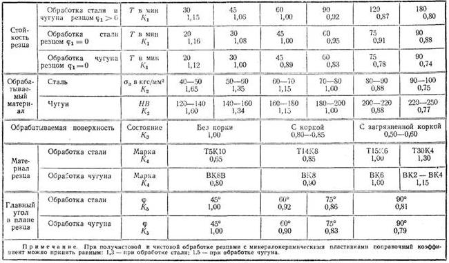 2) числовое значение этой скорости умножается на поправочные коэффициенты, учитывающие конкретные условия предстоящей обработки.