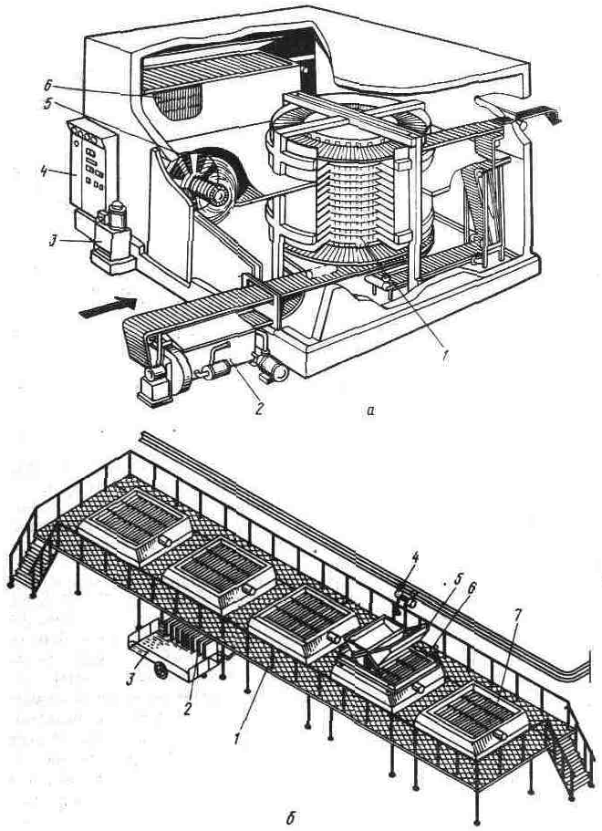 а — со спиральным конвейером и одним барабаном для замораживания готовых блюд и кулинарных изделий: 1—грузовой конвейер; 2 —устройство для мойки транспортерной ленты; 3 — гидравлический агрегат: 4 — щит управления; 5 — вентилятор; 6 — охлаждающие батареи; б — линия с мембранными аппаратами ФМБ-2: 1—площадка для обслуживания; 2 — замороженный блок мяса; 3 — тележка; 4 — тельфер; 5 — загрузочный ковш; 6 — питатель; 7—мембранный аппарат