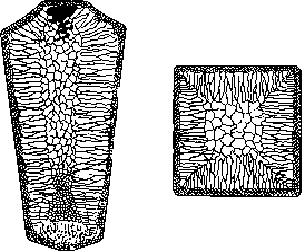 Металлический слиток имеет неоднородное строение, связанное как с различной скоростью охлаждения по его объему, так и с явлением ликвации, усадки и пр. (рис. 4 и 5).