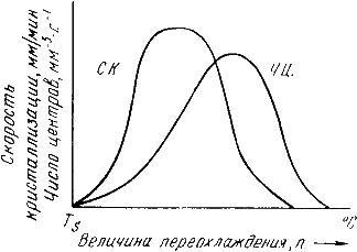 При равновесной температуре кристаллизации Т>пл >число образовавшихся центров кристаллизации и скорость их роста равняются нулю, поэтому процесса кристаллизации не происходит.