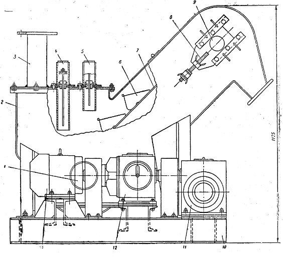 1 - приводной барабан; 2 - корпус дозатора; 3 - приемный патрубок; 4 - контакт нижнего уровня; 5 - контакт верхнего уровня; 6 - ковш; 7 - лента ковшового питателя; 8 - натяжное устройство; 9 - натяжной барабан; 10 - рама; 11 - червячный редуктор; 12 - вариатор; 13 - электродвигатель.