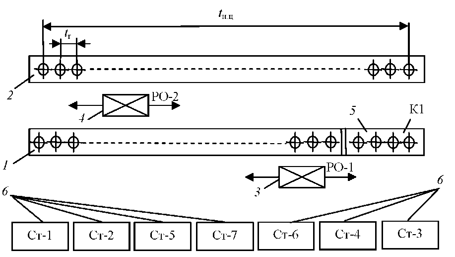 Рис. 5.2 – Предварительная схема компоновки АСИО с центральным складом-накопителем инструментов:1, 2 – накопители инструментов; 3, 4 – роботы-автооператоры доставки инструментов, расположенные соответственно со стороны станков РО-1 и между накопителями РО-2; 5 – подъемная кассета инструментов К1; 6 – станочный комплекс ГПС
