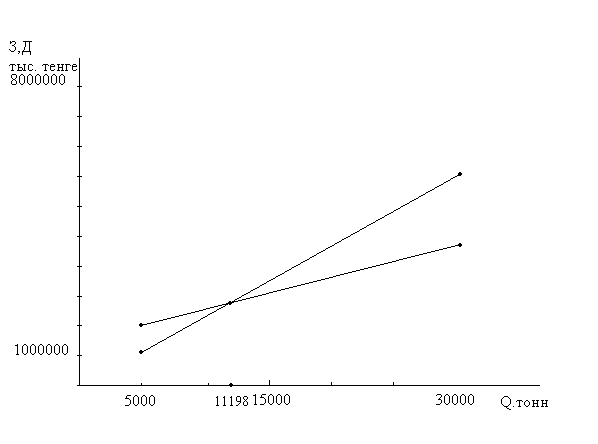 Для нахождения точки безубыточности графическим способом строим график в координатах Q-З, Д