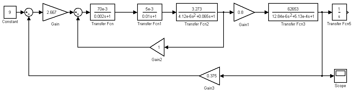 Согласно структурной схеме динамической модели следящего гидропривода (рис. 12.1) при помощи пакета MatLab проводим исследование переходного процесса функционирования привода при максимальной скорости движения и отсутствии статического крутящего момента (рис.12.2).