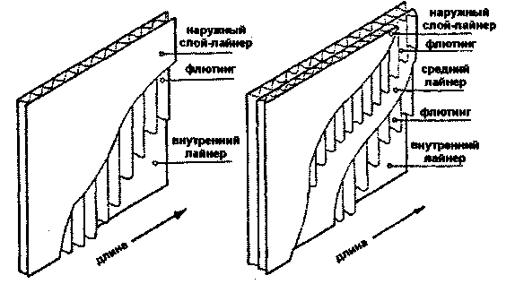 Трехслойный гофрокартон типа «Т» состоит из двух плоских слоев - лайнеров, приклеиваемых к третьему гофрированному слою - флютингу. Пятислойный гофрокартон типа «П» соответственно состоит из трех лайнеров и двух флютингов, семислойный - три флютинга и четыре лайнера. В основном пяти и семислойный гофрокартон используется при изготовлении контейнеров, предназначенных для грузоемких и объемных товаров, таких как машинное оборудование, бытовая аппаратура или мебель.