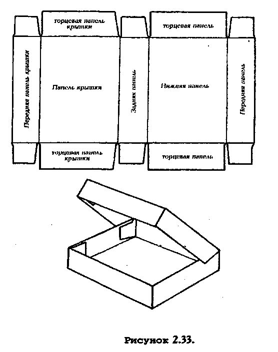 Более удобный вариант подобного лотка имеет крышку и прикрепленный засовывающийся клапан. Противопыльные клапаны, идущие обычно от торцевых панелей корпуса, усиливают жесткость коробки. Боковые засовывающиеся клапаны могут быть также размещены на концах крышки, но нельзя иметь клапаны и на корпусе, и на крышке.