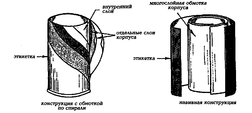 Спирально-навивные банки обычно изготавливаются из трех накладываемых друг на друга спиральных витков крафт-бумаги. Внутренний виток может быть ламинирован алюминиевой фольгой или полиэтиленом для обеспечения защитного от влаги барьера. Такие банки имеют круглый корпус.