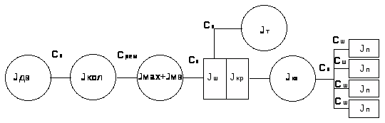 Для составления расчетной схемы механизма (то есть для проведения теоретических исследований) реальную механическую часть электропривода заменяем динамически эквивалентной приведенной расчетной схемой, состоящей из сосредоточенных инерционных элементов, соединенных между собой упругими связями, и обладающей таким же энергетическим запасом, как и исходная, реальная система привода.