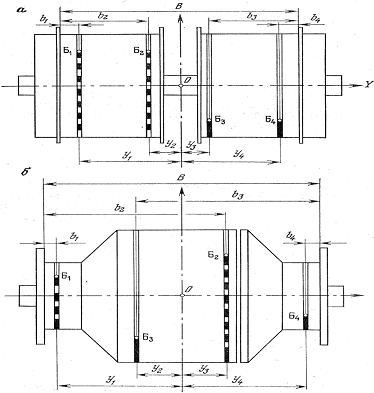 Рисунок 2.11 - Схемы определения ординат точек схода каната с барабана подъемной машины: а - типа 2Ц; б – типа Ц и БЦК