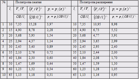 Задавая значения l>i> в диапазоне изменения отрезка от точки А до точки В, подсчитываем величины давлений в промежуточных точках политроп сжатия и расширения.