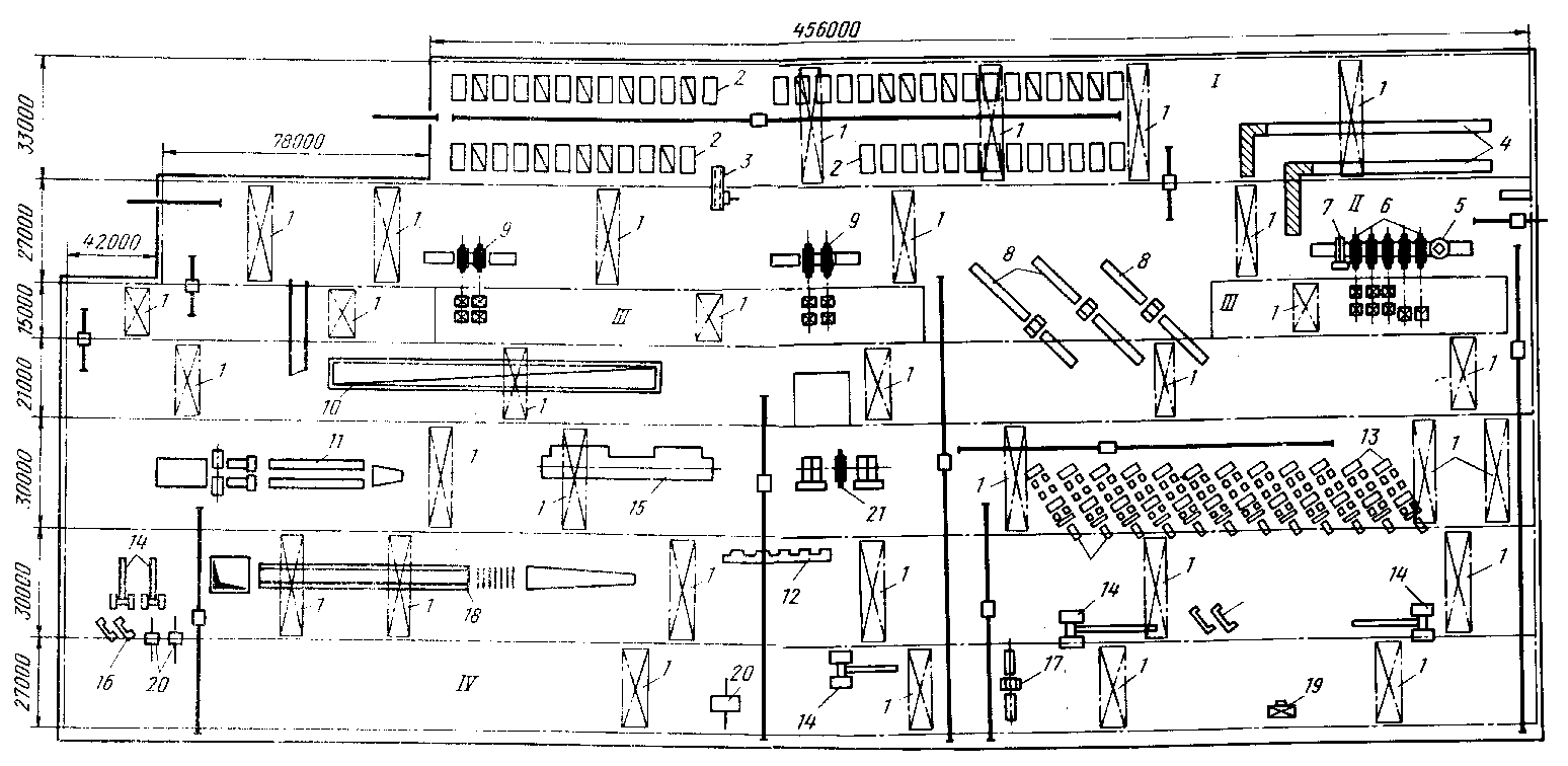 I - отделение отжига, II - пролет стана, III - машинный зал, IV - склад готовой продукции; 1 - мостовые краны, 2 - отжигательные печи, 3 - кантователи, 4 - агрегат электролитической очистки, 5 - разматыватель, 6 - линия стана, 7 - моталка, 8 - агрегат резки, 9 - дрессировочные станы, 10 - непрерывный агрегат, 11 - агрегат электролитического лужения жести, 12 - сортировщик листов, 13 - агрегаты горячего лужения, 14 - сортировочные агрегаты, 15 - агрегат подготовки полосы, 16 - ножницы, 17 - агрегат поперечной резки, 18 - агрегат оцинкования, 19 - весы, 20 - автопогрузчик, 21 - машина для промасливания.