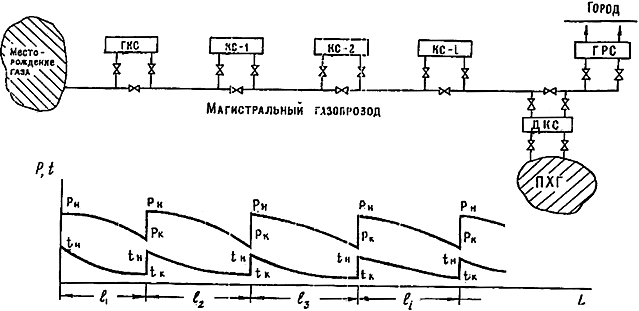 Принципиальная схема расположения КС вдоль трассы магистрального газопровода приведена на рис. 2, где одновременно схематично показаны изменения давления и температуры газа между КС.