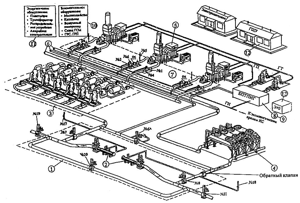 Рис. 1 Принципиальная схема компоновки основного оборудования компрессорной станции