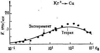 Рис. 2. Зависимость коэффициента распыления Си от энергии бомбардирующих ионов Кr+ [8].
