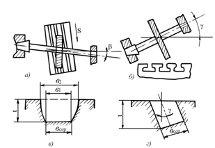 6. Відхилення β від перпендикулярності осі обертання фрези до пазів стола (рис. 6, а) і відхилення γ від паралельності осі обертання фрези робочій поверхні стола (рис. 6, б) викликають відповідно збільшення ширини паза (рис. 6, в) і його поворот (рис. 6, г).