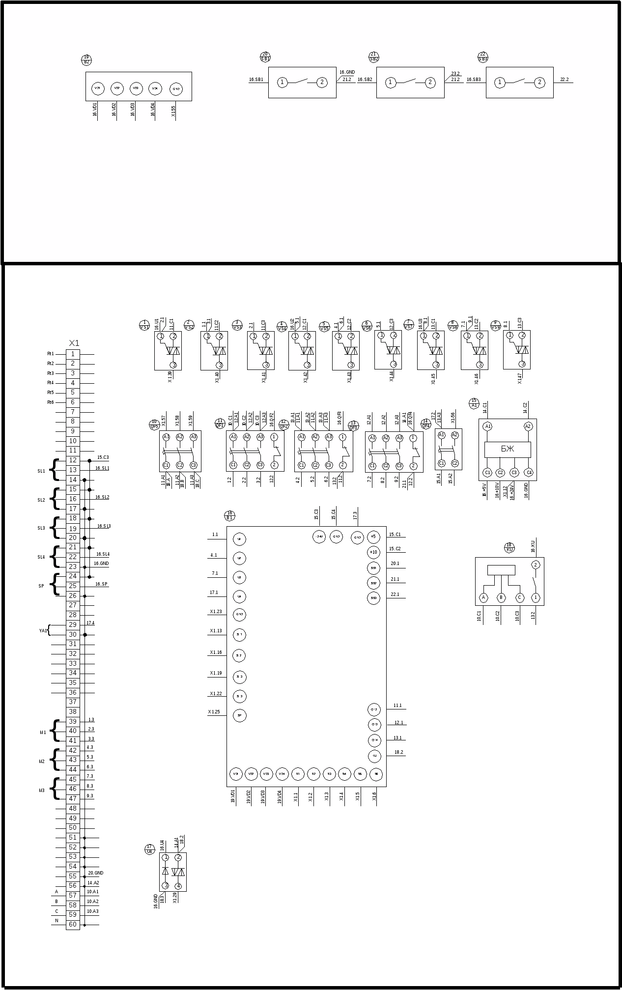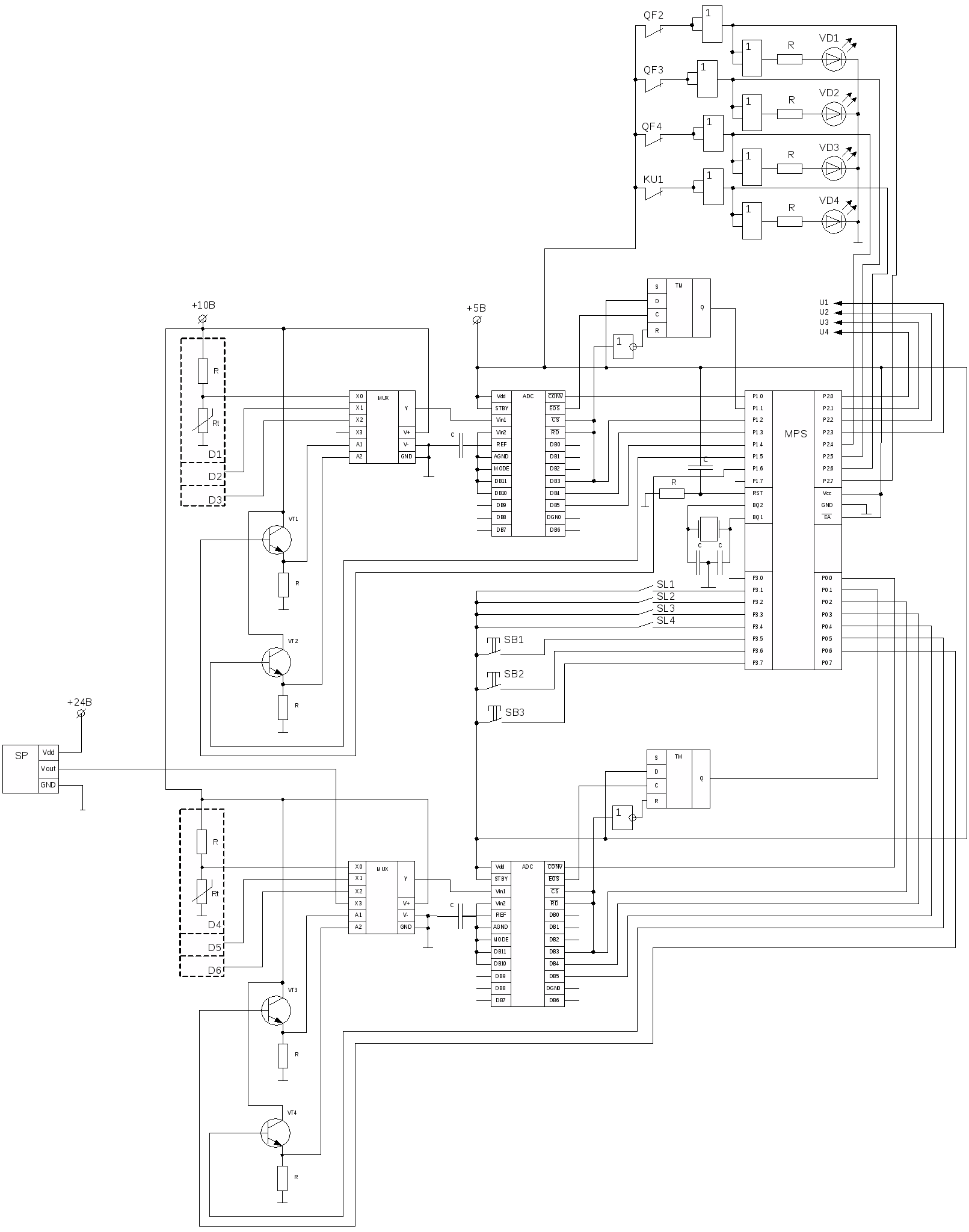 Схема електрична принципова складається з мікроконтроллера, двох АЦП та двох мультиплексорів які в об‘єднанні складають блок контролю та управління технологічних параметрів. Програмно мікроконтроллер опитує кожен з датчиків на предмет виміру вихідного параметру шляхом подачі управляючого сигналу на входи А1 та А2 мультиплексорів. На входи мультиплексорів під‘єднуються аналогові датчики температури та аналоговий датчик тиску.
