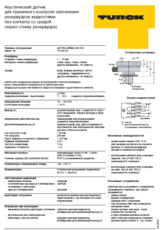 Для контролю та сигналізації рівня будуть застосовуватися акустичні датчики граничного заповнення типу LP-T50-UP6X3-H2151 фірми TURCK.