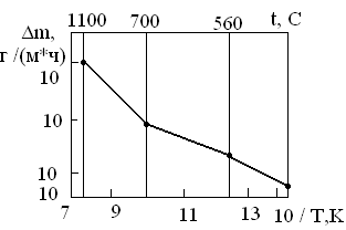 Рис. 3. Влияние температуры на скорость окисления Δm железа на воздухе