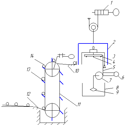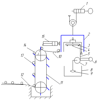 Автоматически замыкается контакт 8КЭП. Срабатывает магнитный пускатель КМ1, включая электродвигатель М1. Происходит перемещение ленточного конвейера и магазина с роликами из зоны обмывки.