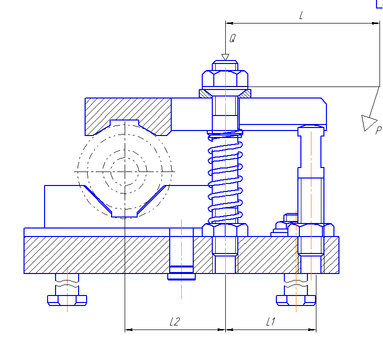 Зажимное устройство в приспособлении будет приводиться в движение непосредственно рабочим, прилагающим исходное усилие Р на плече L (при помощи гаечного ключа)