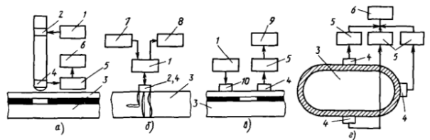 На рисунке: а — импедансный; б — резонансный; в — свободных колебаний; г — акустико-эмиссион; 1 — генератор; 2 — излучатель; 3 — объект контроля; 4 — приемник, 5 — усилитель; 6 — индикатор; 7 — модулятор частоты; 8 — регистратор резонанса; 9 — спектро-анализатор, 10 — вибратор.