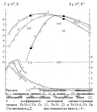 1.Для γ-Fe-Ni сплавов характерно, что в слабом ферромагнитном состоянии спонтанная магнитострикция обратнопропорциональна квадрату температуры, а коэффициент спонтанной магнитострикции имеет положительное значение. В сильном ферромагнитном состоянии при температурах ниже tк в γ-Fe-Ni сплавах магнитный вклад в ТКЛР практически не обнаруживается и только в узкой области температур, примыкающей к Тс , спонтанная магнитострикция сплавов по составу близких к Ni пропорциональна квадрату температуры, а коэффициент спонтанной магнитострикции имеет малые значения и отрицательный знак.
