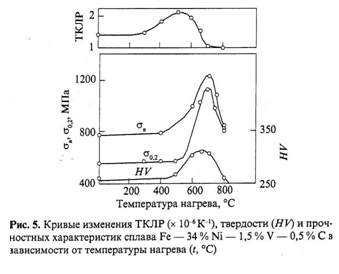 Процессы изменения атомно-кристаллической структуры при нагреве сплавов Fе — Ni — С — V при водят к изменению механических свойств (рис.4.2 ). Наибольший прирост прочностных свойств отмечается при нагреве в области температур 550 - 700 °С, когда наиболее активно протекают процессы атомного пере распределения и выделения мелкодисперсных фаз FезС и VC. Повышение более чем вдвое уровня значений прочностных свойств после нагрева до 600 - 650 °С сопровождается лишь незначительным изменением величины ТКЛР — не более чем на (0,5 - 1,0) • 1(Н К-1 (см. рис. 4.2).