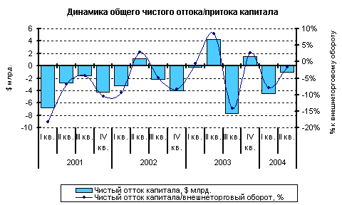 Всего общий чистый отток капитала из частного сектора (сальдо официального и неофициального потоков) в I полугодии т.г., по нашим оценкам, составил $5,5 млрд. (в I полугодии 2003 г. наблюдался приток капитала в размере $4 млрд.) (см. рисунок ниже). В том числе чистый официальный приток капитала в негосударственный сектор составил $4,2 млрд., что более чем в 3 раза ниже уровня I полугодия 2003 г. В отношении к внешнеторговому обороту общий отток капитала в I полугодии т.г. составил 4,6%. В том числе, во II квартале т.г. общий чистый отток капитала из негосударственного сектора снизился до $1,1 млрд., а по отношению к торговому обороту – до 1,7%.