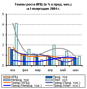 Вывод: Линия тренда для ИПЦ в целом в I полугодии 2004 г. менее наклонна, что говорит о меньшем разбросе прироста цен по месяцам и стабилизации ежемесячных темпов роста на уровне примерно 1%. Для продовольственных товаров линия тренда в 2003-2004 гг. имеет примерно схожий характер, за исключением более умеренных ее колебаний в 2004 г., что также свидетельствует о стабилизации уровня темпов роста цен на продовольствие на определенном уровне (около 1% в месяц). Тренд, построенный для непродовольственных товаров, в течение первых трех месяцев имел горизонтальный характер, однако с апреля-мая начал возрастать. В аналогичном периоде 2003 г. тенденция ежемесячного прироста цен непродовольственных товаров была в целом понижательной.