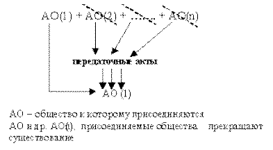 Присоединением общества признается прекращение одного или нескольких обществ с передачей всех прав и обязанностей другому обществу (ст. 17 Закона "Об акционерных обществах"). К последнему при этом переходят права и обязанности присоединенного в соответствии с передаточным актом (см. схему 3).
