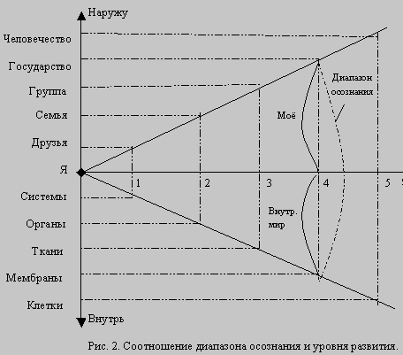 Обсуждаемое соотношение иллюстрируется риунком 2. По горизонтальной оси отложены этапы развития, соответствующие уровням адаптации рисунка 1, а по вертикальной оси - иерархические уровни социальных структур (вверх - означает наружу) и структур организма (вниз - внутрь).