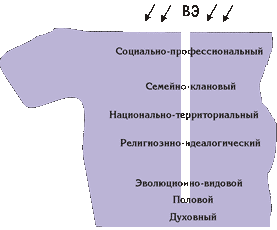 Эволюционно-видовой. Я - человек. Эта идентификация кажется довольно банальной, однако заглянув немного глубже, мы найдем очень интересные оттенки. Эволюционно-видовая идентификация тесно связана с архетипами и “эволюционной памятью” [3]. В первобытных культурах это создает прямые утверждения СИ, связанные с религиозным и семейно-клановыми уровнями: я - орел; я - лев; я - волк и т. д. В западной культуре такие ассоциативные связи редко выходят на поверхность, однако в некоторых ситуациях и состояниях сознания они также играют свою роль(См. Лирическое отступление 1).