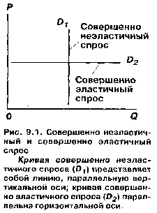 Следует подчеркнуть, что говоря о неэластичном спросе, экономисты не имеют в виду абсолютную нечувствительность потребителей к изменению цен. Совершенно неэластичный спрос означает крайний случай, когда изменение цены не приводит ни к какому изменению количества спрашиваемой продукции. Примером может служить спрос больных острой формой диабета на инсулин или же спрос наркоманов на наркотики. Какая бы ни была цена, пусть в 100 раз больше первоначальной, все равно будут покупать алкоголь, сигареты, наркотики, инсулин и т.д. Графически этот случай показывают при помощи кривой спроса, параллельной вертикальной оси (например, D>1> на рис. 9.1).