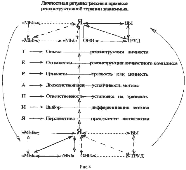 Проанализировав опыт отечественной и зарубежной наркологии, учитывая собственные успехи и неудачи, мы пришли к выводу, что помимо мотивационных, интернальных и ценностных ориентаций (Т.Н.Дудко, 1999г.), необходимо восстанавливать систему отношений, определяющую экзистенцию человека. Все это позволило нам построить методологический ряд реконструктивной терапии, обеспечивающий личностную ретрансгрессию. (рис.4)