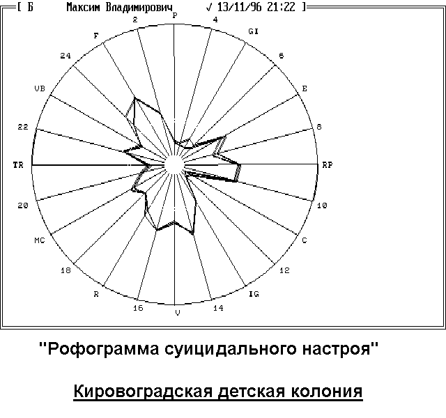 Подобие рисунков даёт возможность выдвинуть гипотезу, что люди, попавшие под воздействие сильнейших стрессогенных факторов, имеют общий "биоэнергетический портрет", отражающийся и в особенностях выявляемых у них нозологических форм. Объединение данных категорий людей в общую группу, обычно называемую “группой риска”, подтверждается их подобными психологическими состояниями, определяемые общепринятыми психологическими методиками. Одним из факторов риска в данной группе является суицид. На рофограмме риск суицида отражается следующим рисунком (см. рисунок 2).