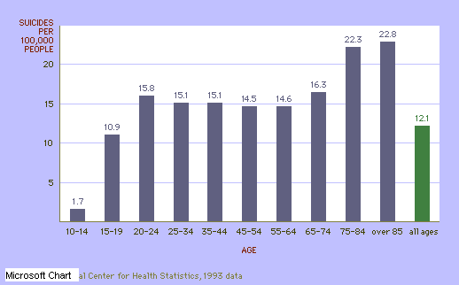 Суицид входит в число первых десяти причин смерти в США. Среди людей старше 75 лет имеют самый высокий уровень суицида, по-видимому, объясняемый отрицательными эффектами психических болезней, потерей социальной роли и скрытой депрессией.