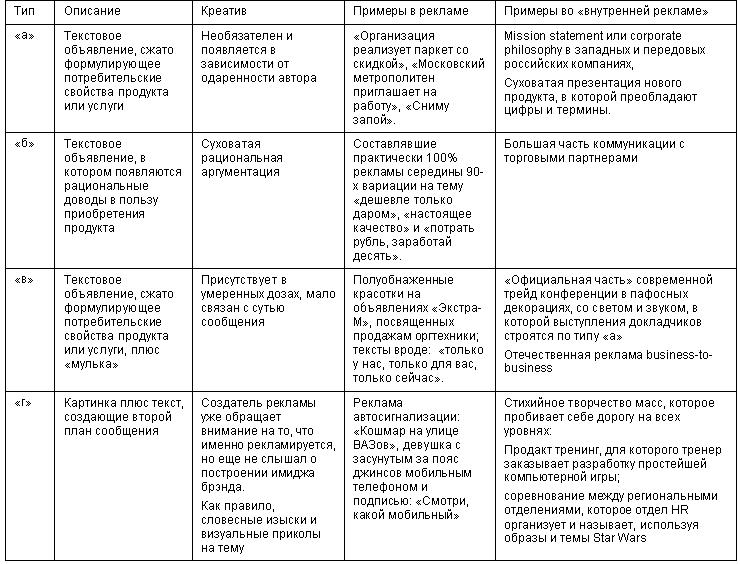 Если судить по этой таблице, "внутренней рекламе" до "ж" очень далеко. К счастью, она пока не стала настоящим искусством, а, значит, еще долго может быть по-настоящему полезной.