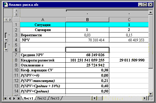 Метод сценариев. В целом метод позволяет получать достаточно наглядную картину для различных вариантов реализации проектов, а также предоставляет информацию о чувствительности и возможных отклонениях, а применение программных средств типа Excel позволяет значительно повысить эффективность подобного анализа путем практически неограниченного увеличения числа сценариев и введения дополнительных переменных.