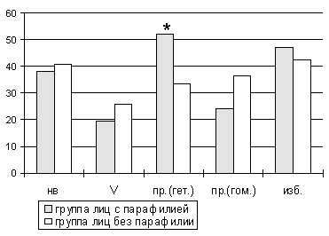 Обнаружены определенные различия между группами испытуемых с различными видами парафилии: так, отмечалась определенная близость по ряду показателей группы лиц с педофилией и без расстройств влечения, тогда как испытуемые с садизмом и эксгибиционизмом в значительной степени отличались от испытуемых без парафилии.