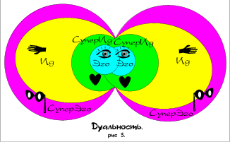На третьем рисунке изображен случай практической дуальности партнеров. В отличие от теории, согласно которой часто создается ложное впечатление что дуал - этакий идеальный святой с нимбом, а ведь на практике сплошь и рядом это человек с "обратной стороны луны", с абсолютно другими ценностями и принципами, не говоря уже про "зловредные" маски. То есть люди близки по духу, и действительно, часто создается впечатление что знаешь человека (своего дуала) давным-давно, хотя и видишь его впервые. Но, чаще всего, у дуалов, как это ни прискорбно, совсем не совпадают внешние, социально-приспособленческие кольца и задаваемые ими программы. Это приводит к тому, что дуалы зачастую оказываются совсем неприспособленными к совместной жизни в заданных социальных условиях, рамках. Проблемами, возникающими между ними, могут быть: разный социальный статус, разная вера, несовместимые привычки, установившиеся сексуальные предпочтения. Но самой большой проблемой здесь является банальный страх снять психологическую оборону. Защиты и комплексы, инерция мышления или инертность сознания не дает человеку принять тот факт, что уже НЕТ необходимости замыкаться и ершиться, лицемерить и притворяться. Еще раз повторяю, что с дуалом можно стать самим собой и не бояться открыться . Это совсем не означает того, что вы должны подписать ему дарственную или выложить все секреты своего бизнеса, это просто дает вам возможность, реализовать все свои сокровенные желания и проявлять свои личные качества, которые вы все время прятали и зажимали . Будьте же, наконец, смелее и гибче: он вас не укусит!