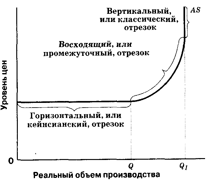 Кейнсианский отрезок означает, что экономика испытывает спад производства; здесь невозможно стимулирование производства за счет роста цен.